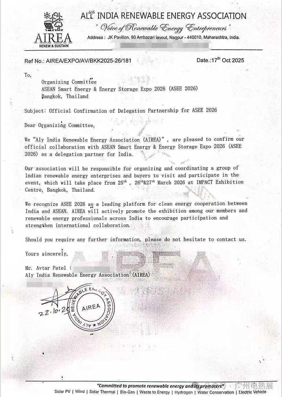 近日,印度可再生能源协会(Aly India Renewable Energy Association, AIREA)正式致函确认,成为“2026东盟智慧能源暨储能博览会(ASEE 2026)”的全球支持委员会成员,并将组织超过200家印度清洁能源及储能领域的企业与专业采购商,于2026年3月25–27日前往泰国曼谷IMPACT展览中心参与此次能源盛会。