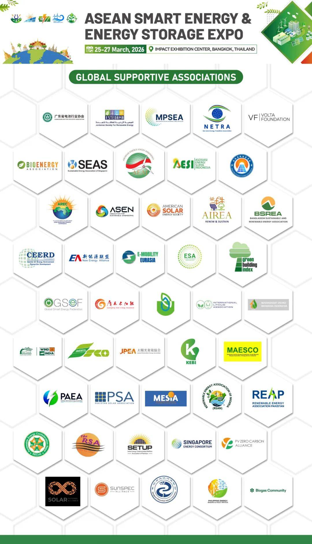 本届展会由鸿威国际会展集团、泰国compass展览公司携手泰国能源部、泰国国家电力局、泰国会展局联合举办,新加坡可持续能源协会、中东太阳能协会、哈萨克斯坦可再生能源协会、土耳其能源产业与商业协会、尼日利亚可再生能源协会、菲律宾能源研究与政策研究院、马来西亚能源服务公司协会、泰国工程师委员会等数十家全球权威机构共同支持。预计吸引超过30个国家的400余家参展企业,展览面积突破30,000平方米。来自工业制造、商业应用及终端消费领域的15,000余名专业观众将到场交流,其中包括3,000余名国际采购决策者。