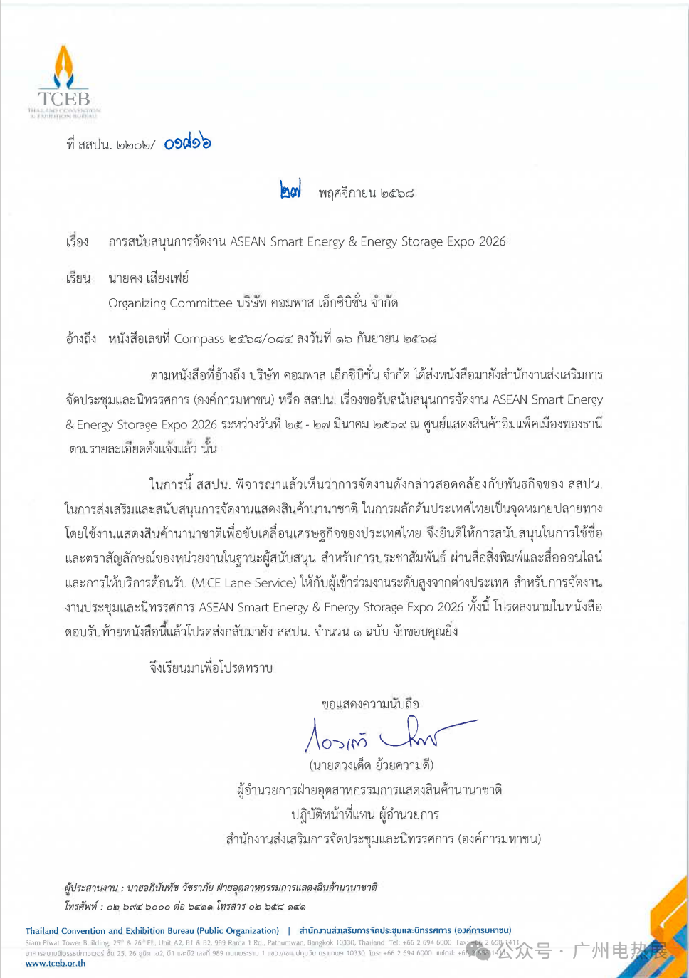 In its response, the TCEB stated that ASEE 2026 aligns closely with its mission to promote Thailand as an international MICE destination, further advancing Thailand's new energy industry through the MICE economy. Accordingly, the Authority has agreed to serve as a supporting organization, authorizing the use of its name and logo for promotional activities across print and online media. It will also provide MICE channel reception services for high-level international guests attending the event.
