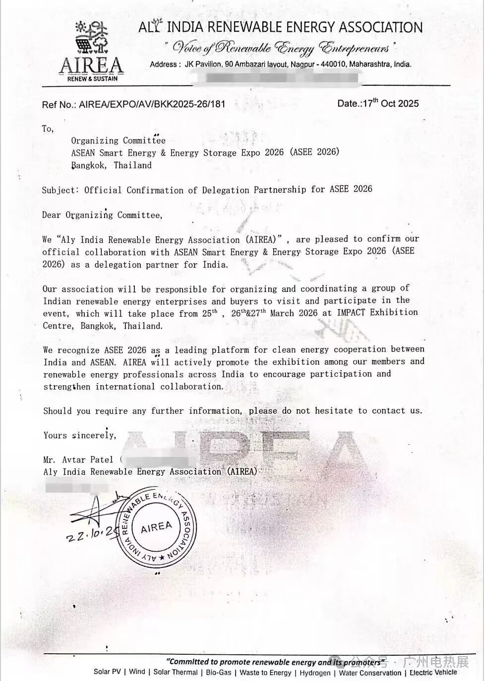 Recently, the Aly India Renewable Energy Association (AIREA) formally confirmed its membership in the Global Support Committee for the ASEAN Smart Energy & Energy Storage Expo (ASEE 2026). It will organize over 200 Indian enterprises from the clean energy and energy storage sectors, along with professional buyers, to attend this energy event at the IMPACT Exhibition Center in Bangkok, Thailand, from March 25–27, 2026.